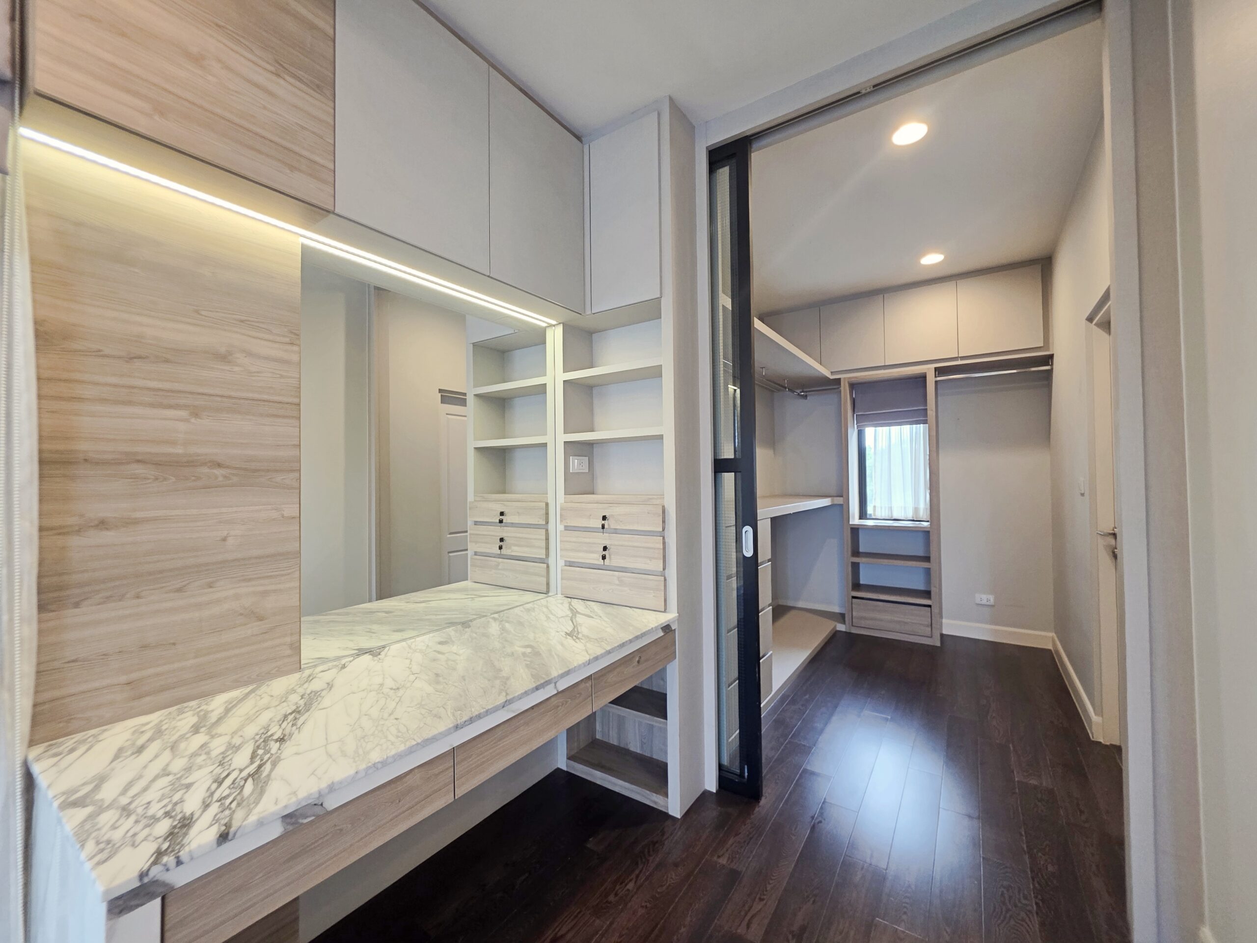 • ห้อง Master bedroom ตกแต่งหรูหรา มีระเบียงฝั่งหน้าบ้าน ตกแต่ง Walk-in closet